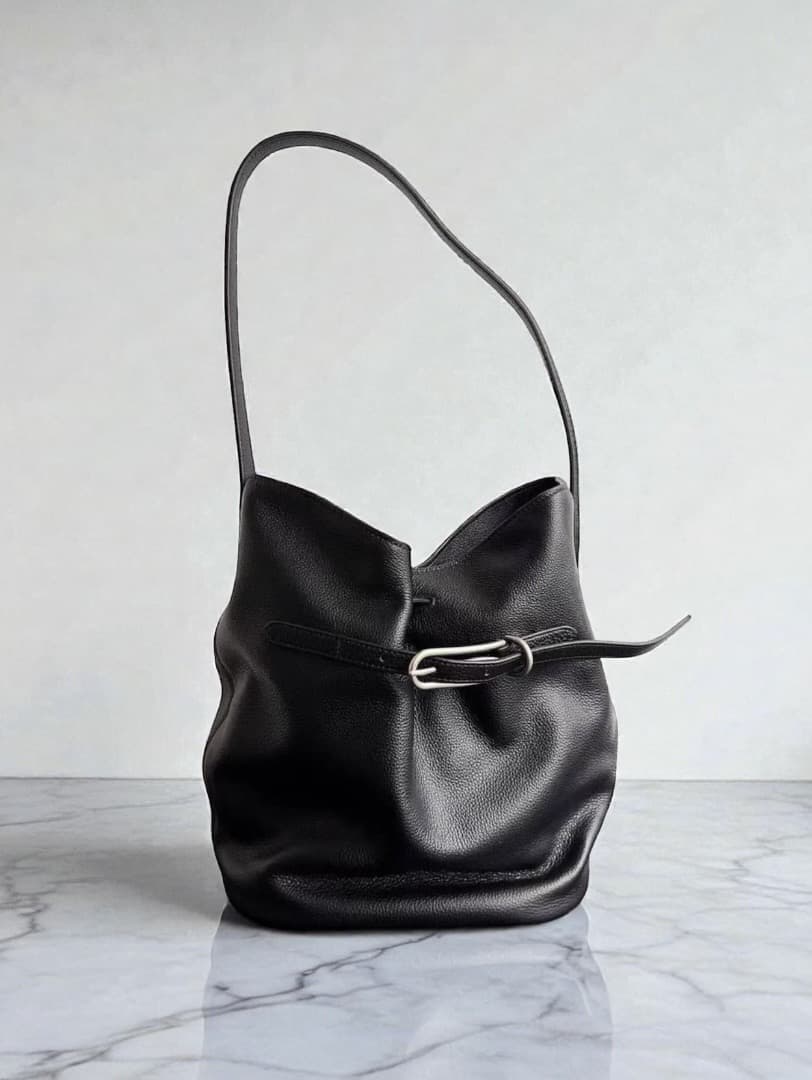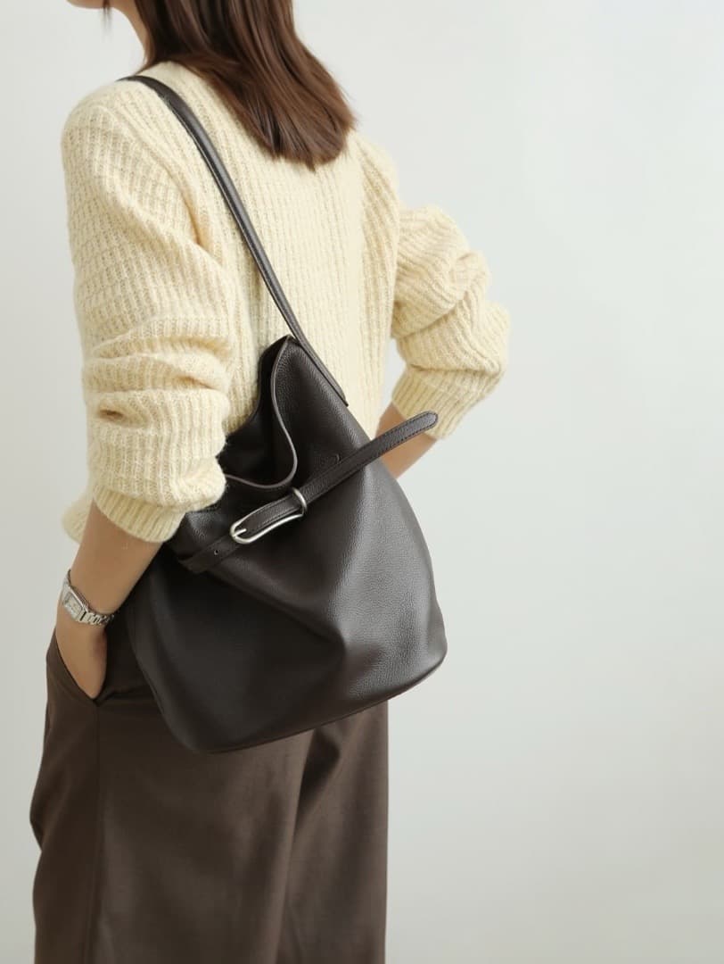 A4書類やタブレットもすっきり収納できる、上質バケットバッグ。オンにもオフにも馴染むシルエットの変化で「大人の毎日を支える、美しい実用品」