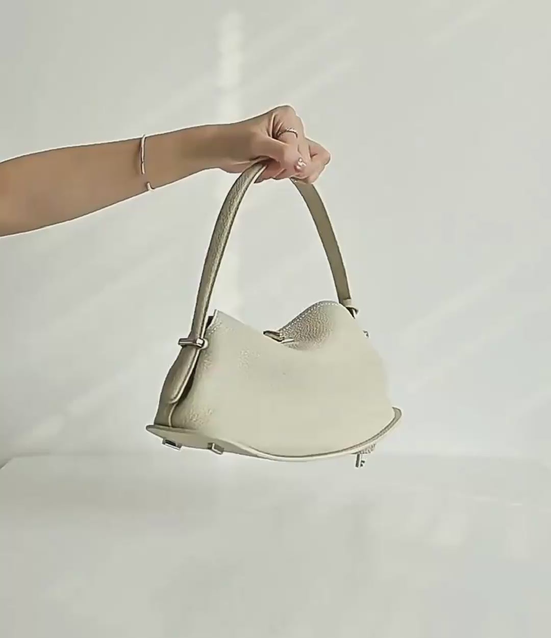 丸みのあるシルエットがやさしい印象をつくりながら、上部のメタルバックルが全体を引き締め、甘すぎず洗練された雰囲気で持てる一品。