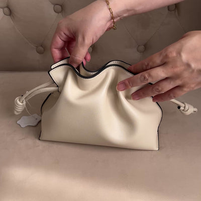 柔らかな牛革と巾着の結びデザインが、上品さと遊び心を演出。