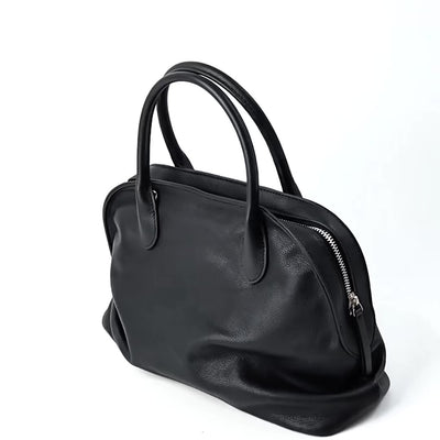 ほどよく力の抜けたシルエットに仕立てたレザーボストンバッグ。