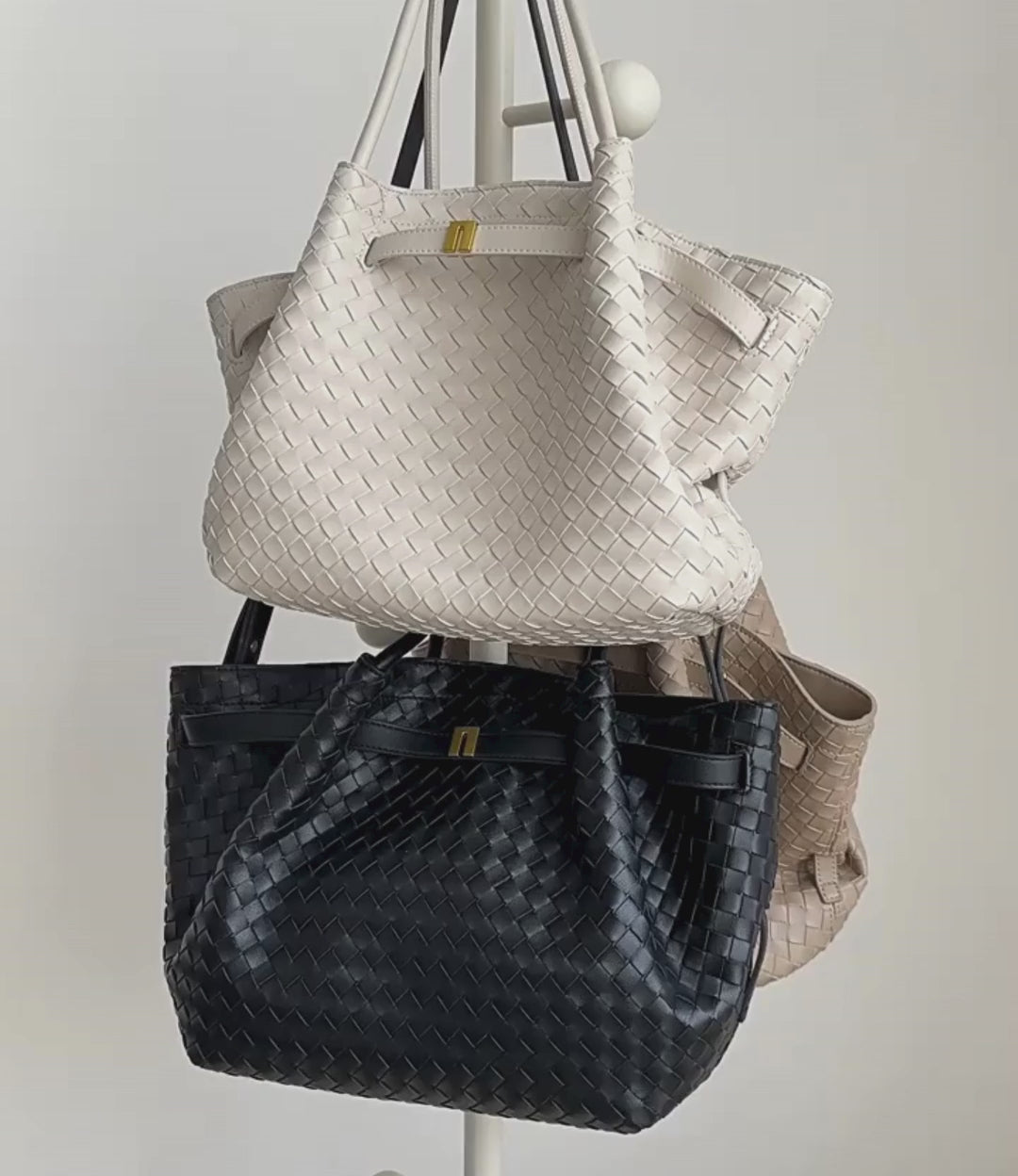 フロントのベルトディテールとゴールド金具が、編み込みデザインに程よい華やぎを添え、